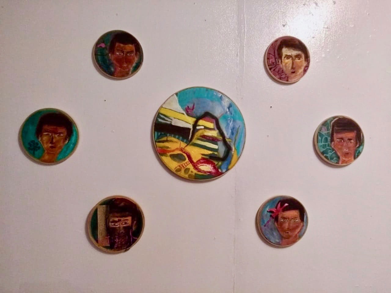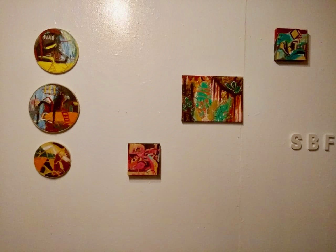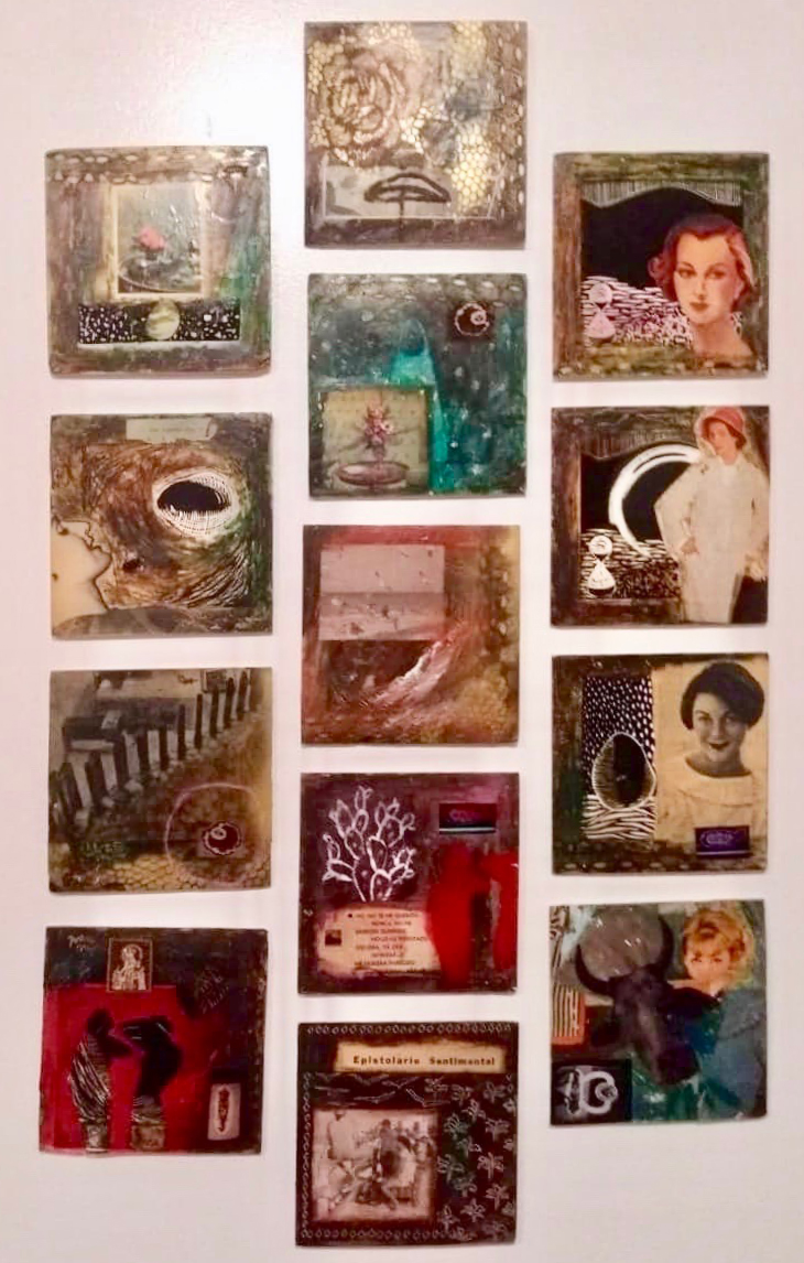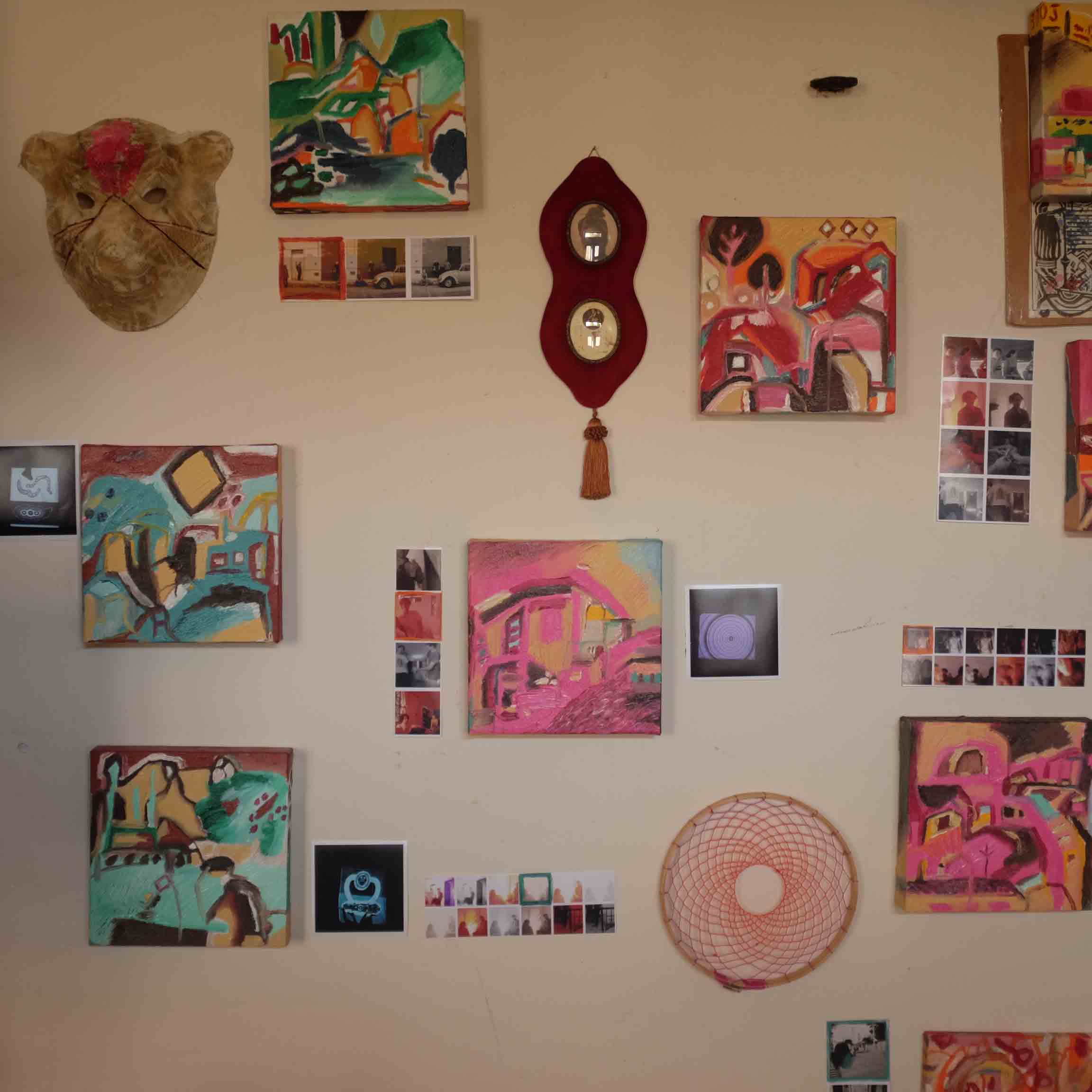 Pintura sobre foamboard y tela, collages, telares, máscaras, pantalla luminosa, video y arte objeto.